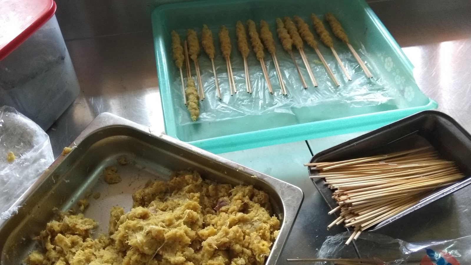 Because Ardi and Indra handle the meats.. i moved to another section to helped my friends. Kemarin saya jalan-jalan mencari pekerjaan lainnya di section Main Kitchen, disana saya membantu Yuli membuat sate lilit.. sebenarnya gagang sate yang dipakai adalah batang serai, tetapi karena Pak Ical menyuruh kami menggunakan 2 tusuk sate, yaa mau tidak mau harus dikerjakan. I thought my friends already know how to make Sate Lilit, but i was wrong. Hampir semua teman-teman kelas saya di hari itu juga baru mengetahui apa itu sate lilit.